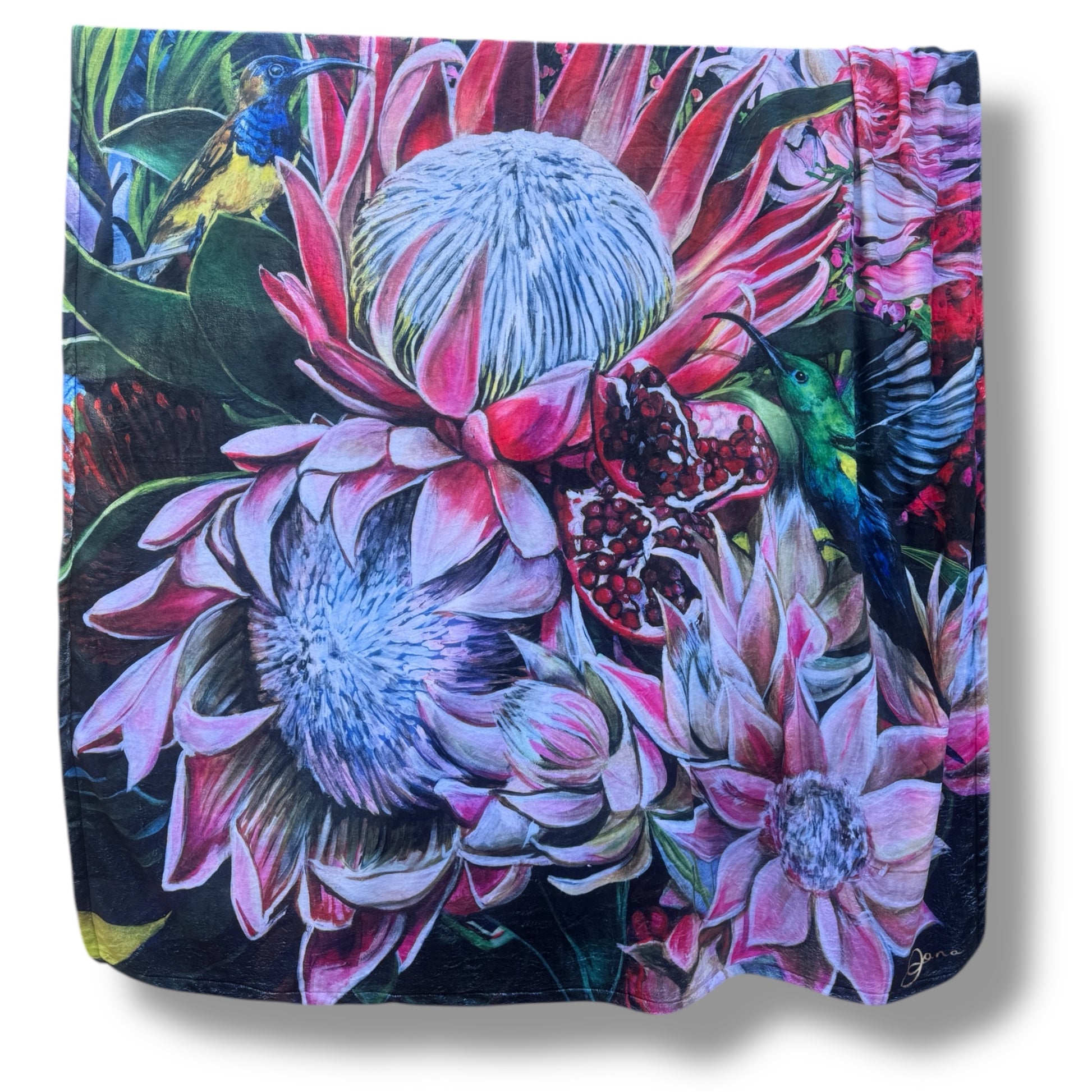 One bespoke plush fleece blanket from Jana Aspeling Art’s vibrant fine art paintings – crafted with attention to detail and easy to care for. This warm and snug Mongolian fleece blanket will brighten up any bedroom or nursery.